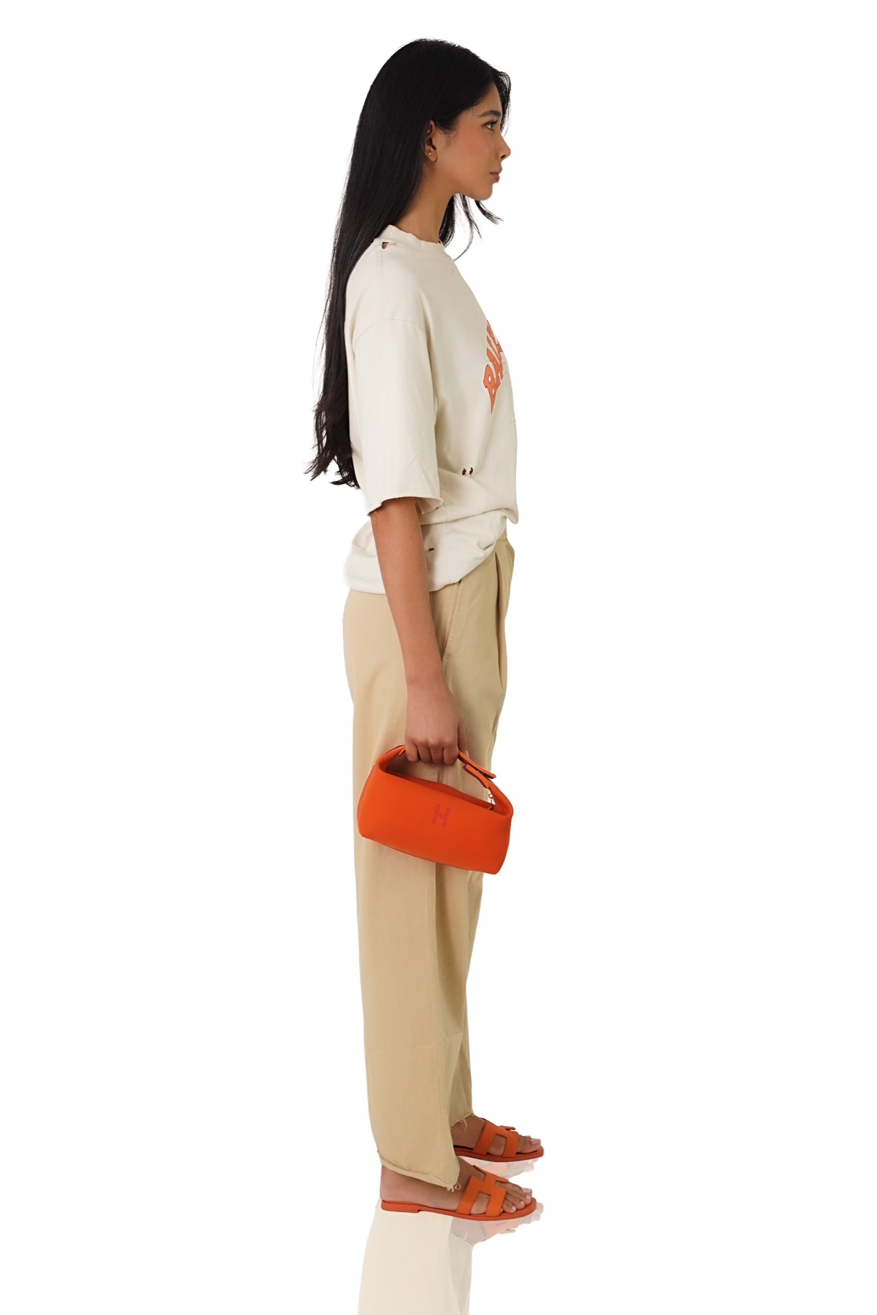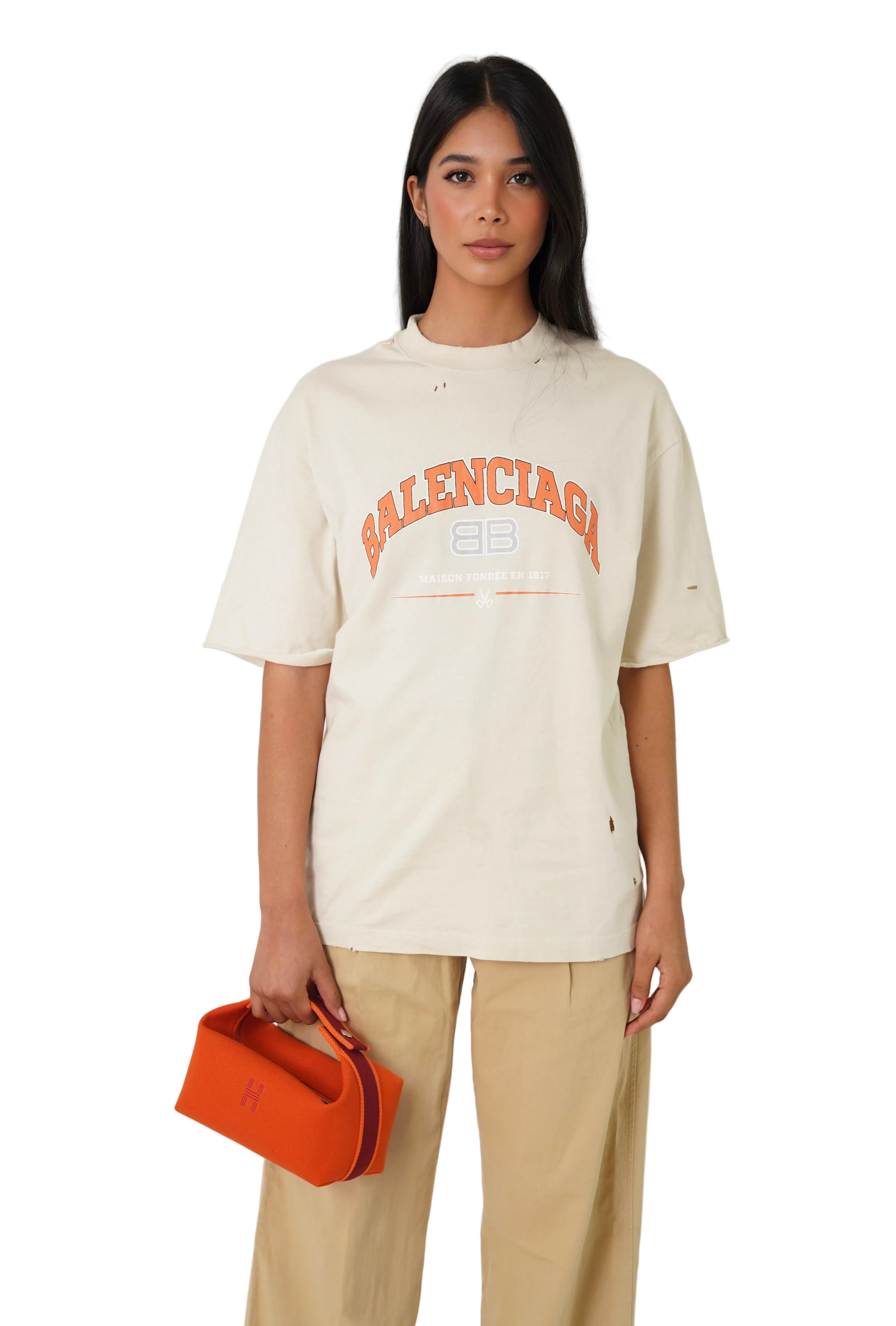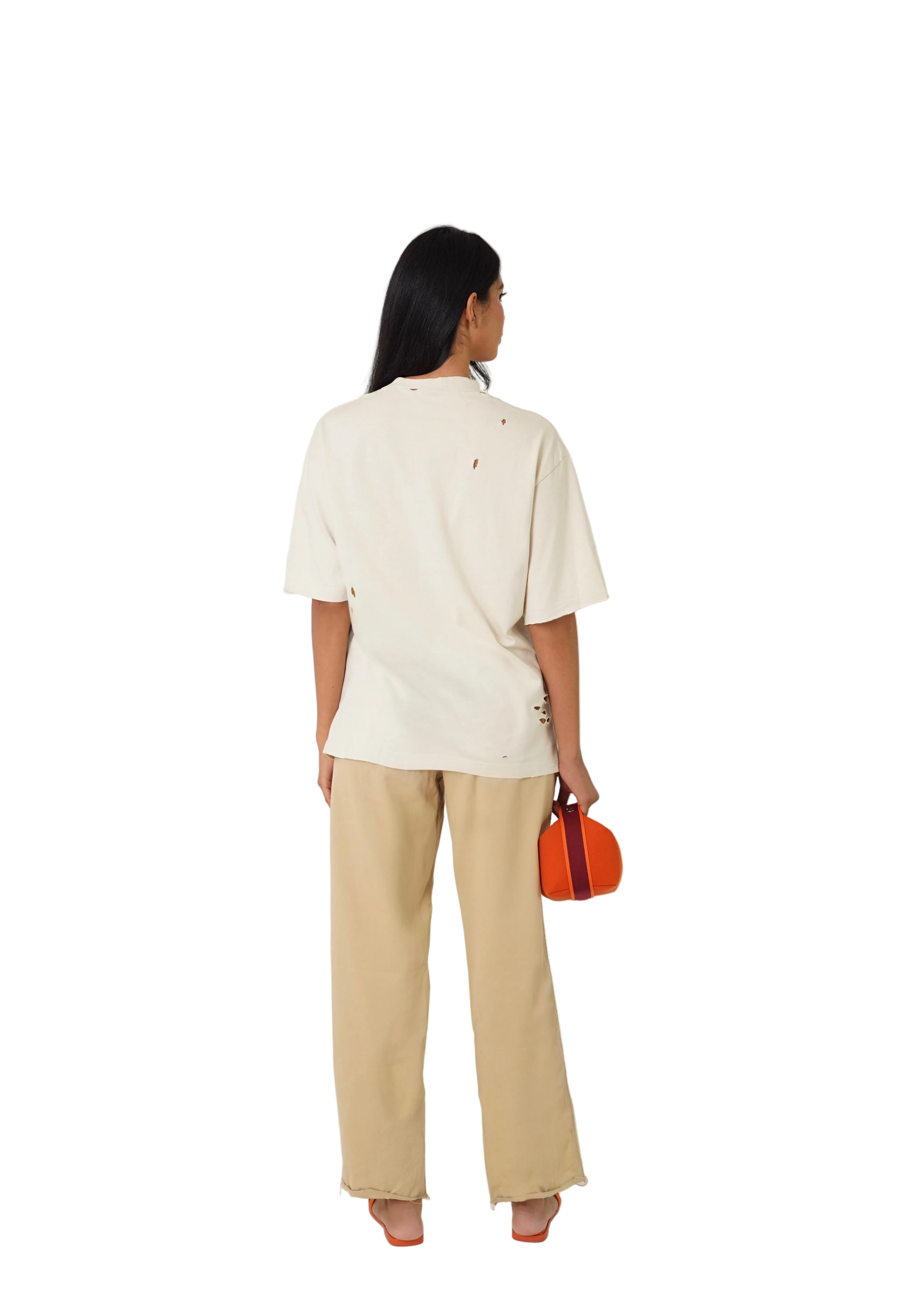 Pre-loved oversized beige T-shirt in very good condition, It has intentionally distressed detailing, including naturally placed small holes, it has no signs of damage.